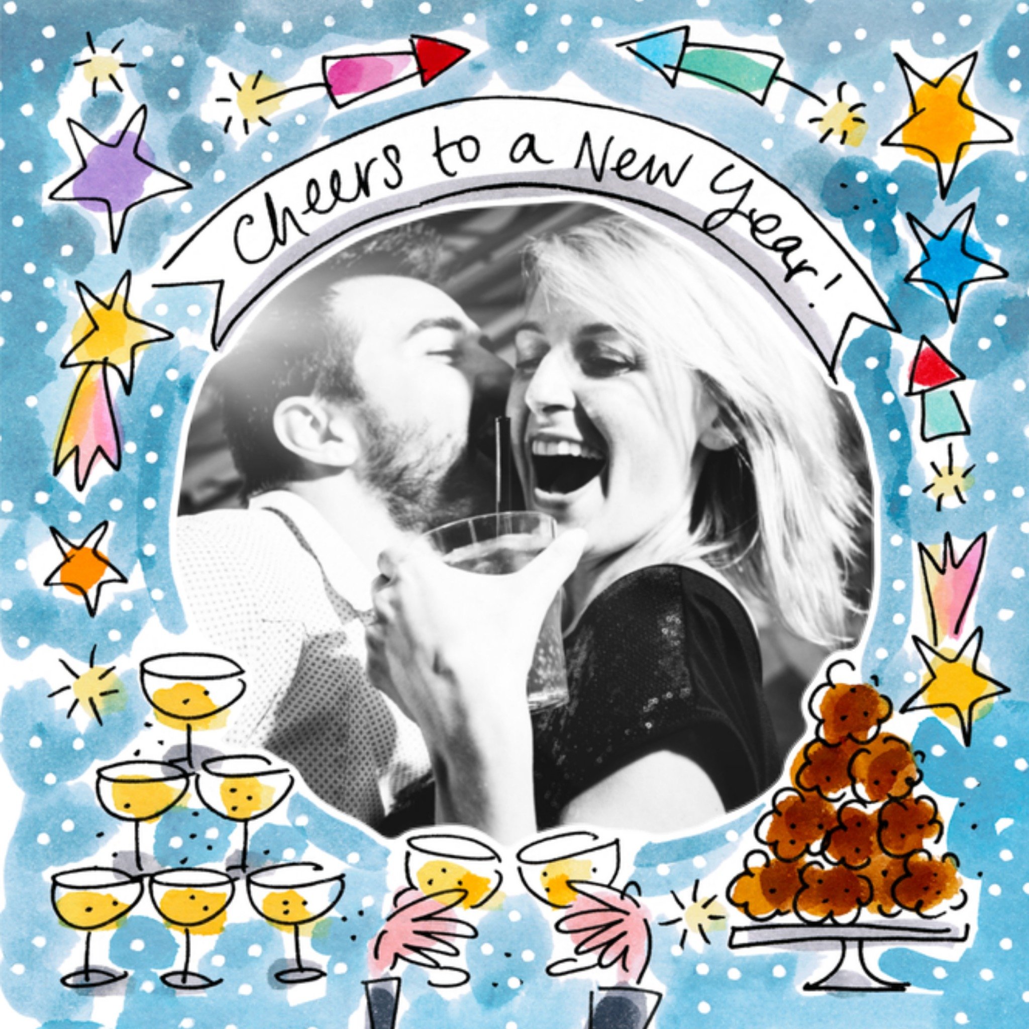 Kerstkaartje van Blond Amsterdam met een groep feestvierende poppetjes. Achter hun zie je de tekst: Happy new year. Wenskaart van Blond Amsterdam met de vrolijke en kleurrijke Blond illustraties. Voeg je eigen foto('s), tekst, & versiering toe om de kaart extra persoonlijk te maken. Je kunt de kaart toevoegen aan je favorieten of tussentijds opslaan om deze later af te maken. Blond Amsterdam Nieuwjaarskaart illustratie Square Card
