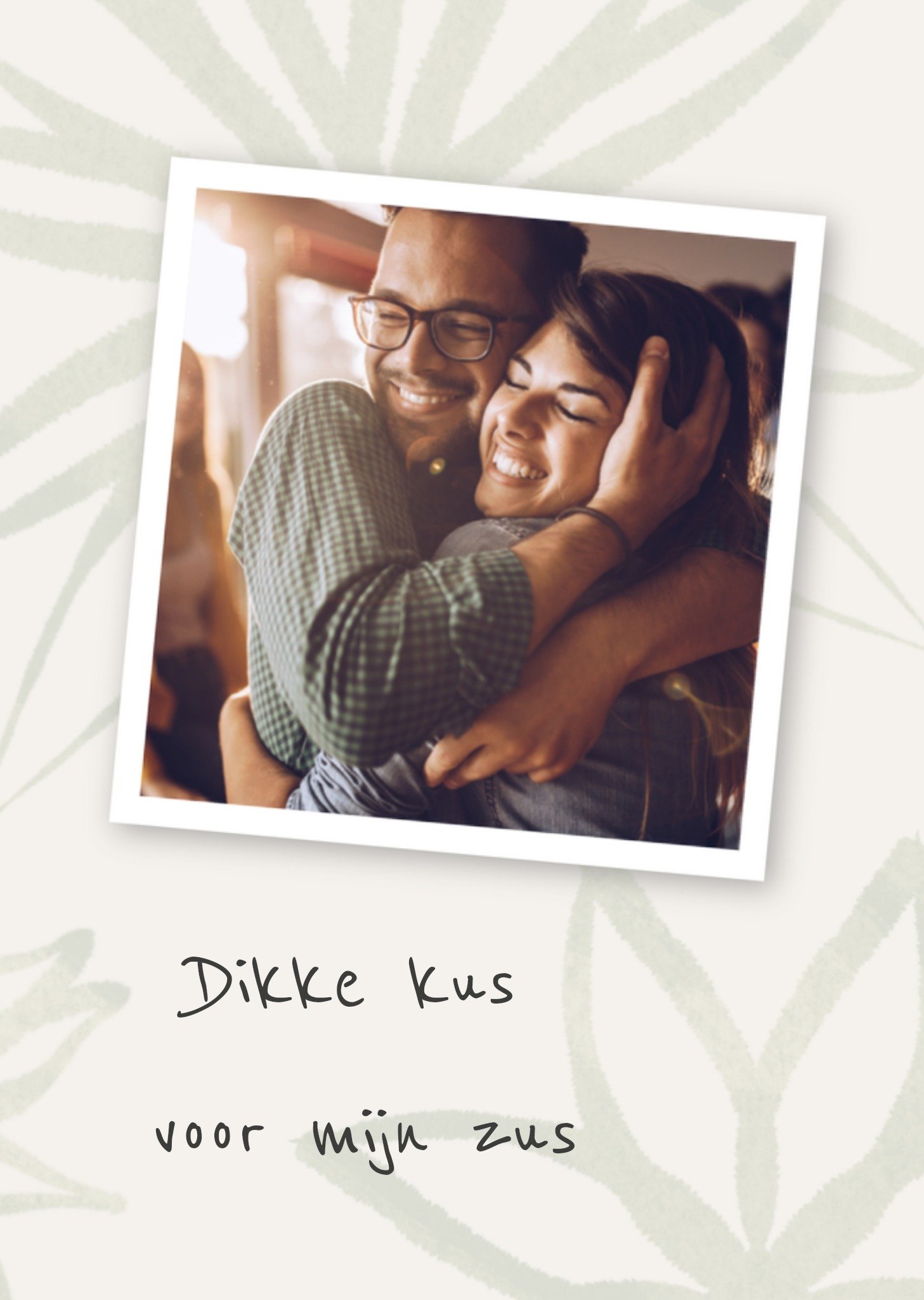 Mooie denken aan kaart die je naar je zus kan sturen met de tekst: Dikke kus voor mijn zus. Voeg een leuke foto toe aan de kaart. Wenskaart van Greetz ontworpen door Greetz designers, volgens de laatste trends. Voeg je eigen foto('s), tekst, & versiering toe om de kaart extra persoonlijk te maken. Je kunt de kaart toevoegen aan je favorieten of tussentijds opslaan om deze later af te maken. Toch liever een ander design? Bekijk alle denken aan kaarten. Greetz Denken aan Dikke kus voor mij zus Pos