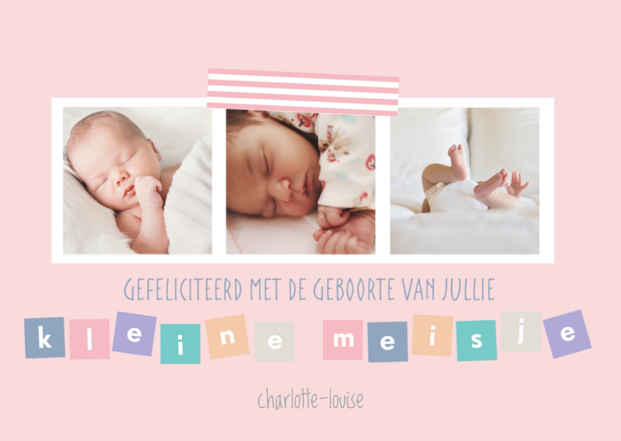 Lieve geboortekaart met foto en de tekst: Onze lieve kleine meid [naam] Wenskaart van Greetz ontworpen door Greetz designers, volgens de laatste trends. Voeg je eigen foto('s), tekst, & versiering toe om de kaart extra persoonlijk te maken. Je kunt de kaart toevoegen aan je favorieten of tussentijds opslaan om deze later af te maken. Meer geboortekaarten zien? Check ze hier. Greetz Geboortekaart kleine meid naam Postcard