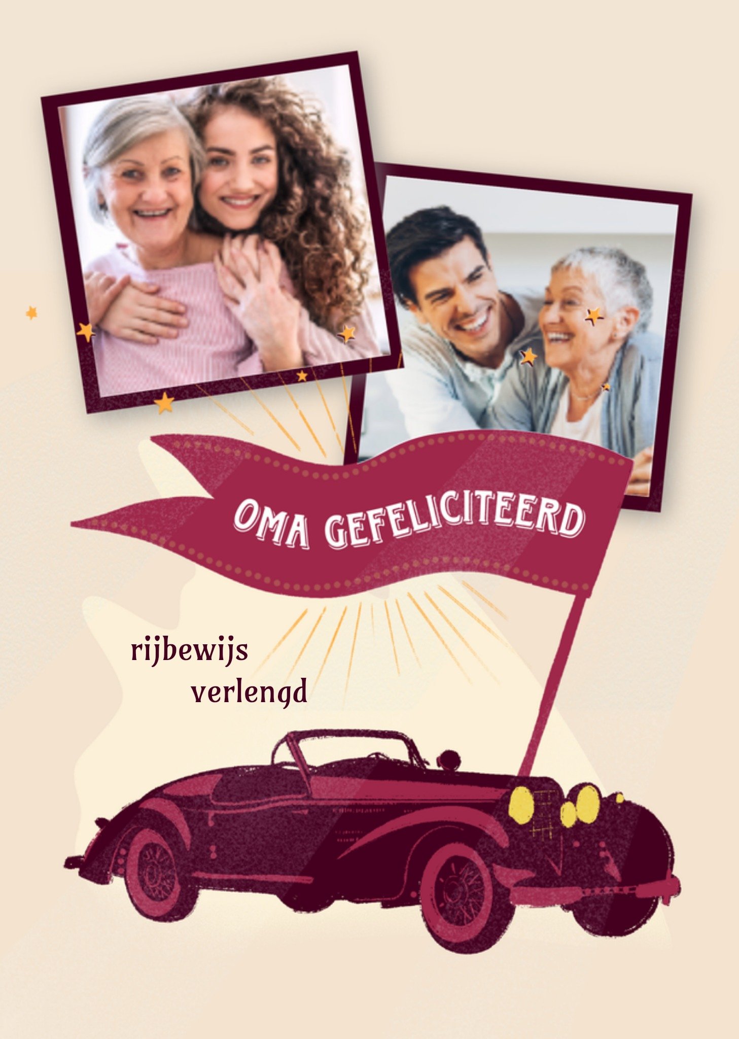 Wauw wat knap nog op zo'n leeftijd. Jouw oma heeft haar rijbewijs weer gehaald. Op deze kaart met auto staat de tekst: Oma gefeliciteerd. Rijbewijs gehaald. Ook kun je een foto toevoegen. Wenskaart van Greetz ontworpen door Greetz designers, volgens de laatste trends. Voeg je eigen foto('s), tekst, & versiering toe om de kaart extra persoonlijk te maken. Je kunt de kaart toevoegen aan je favorieten of tussentijds opslaan om deze later af te maken. Meer geslaagdkaarten zien? Check ze hier. Greetz