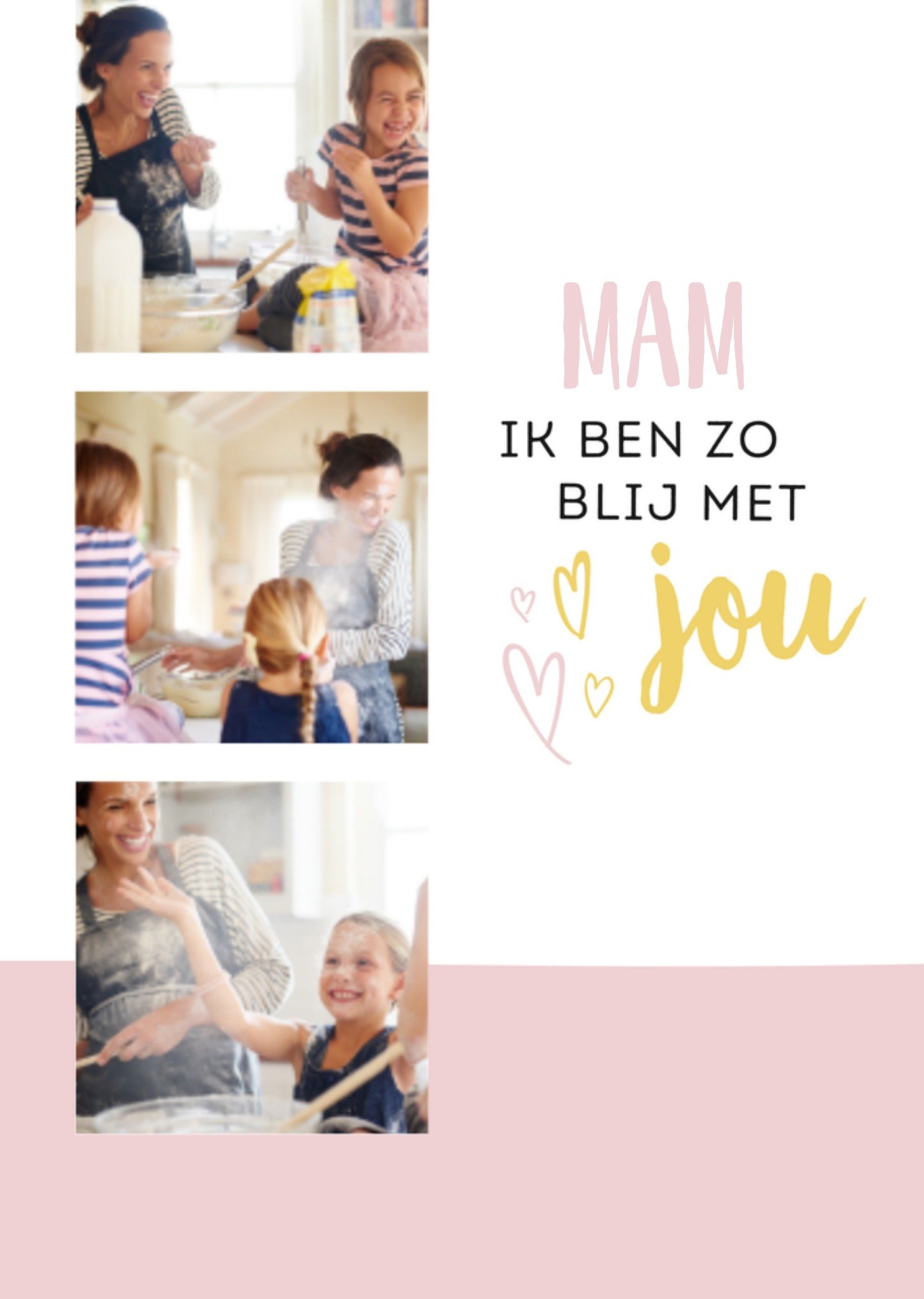Mooie moederdagkaart van Greetz waarop je drie mooie foto's kan toevoegen. Op de kaart staat de tekst "mam ik ben zo blij met jou", waarvan het bovenste woord aanpasbaar is. Het onderste gedeelte van de kaart is roze. Wenskaart van Greetz ontworpen door Greetz designers, volgens de laatste trends. Voeg je eigen foto('s), tekst, & versiering toe om de kaart extra persoonlijk te maken. Je kunt de kaart toevoegen aan je favorieten of tussentijds opslaan om deze later af te maken. Meer Moederdagkaar