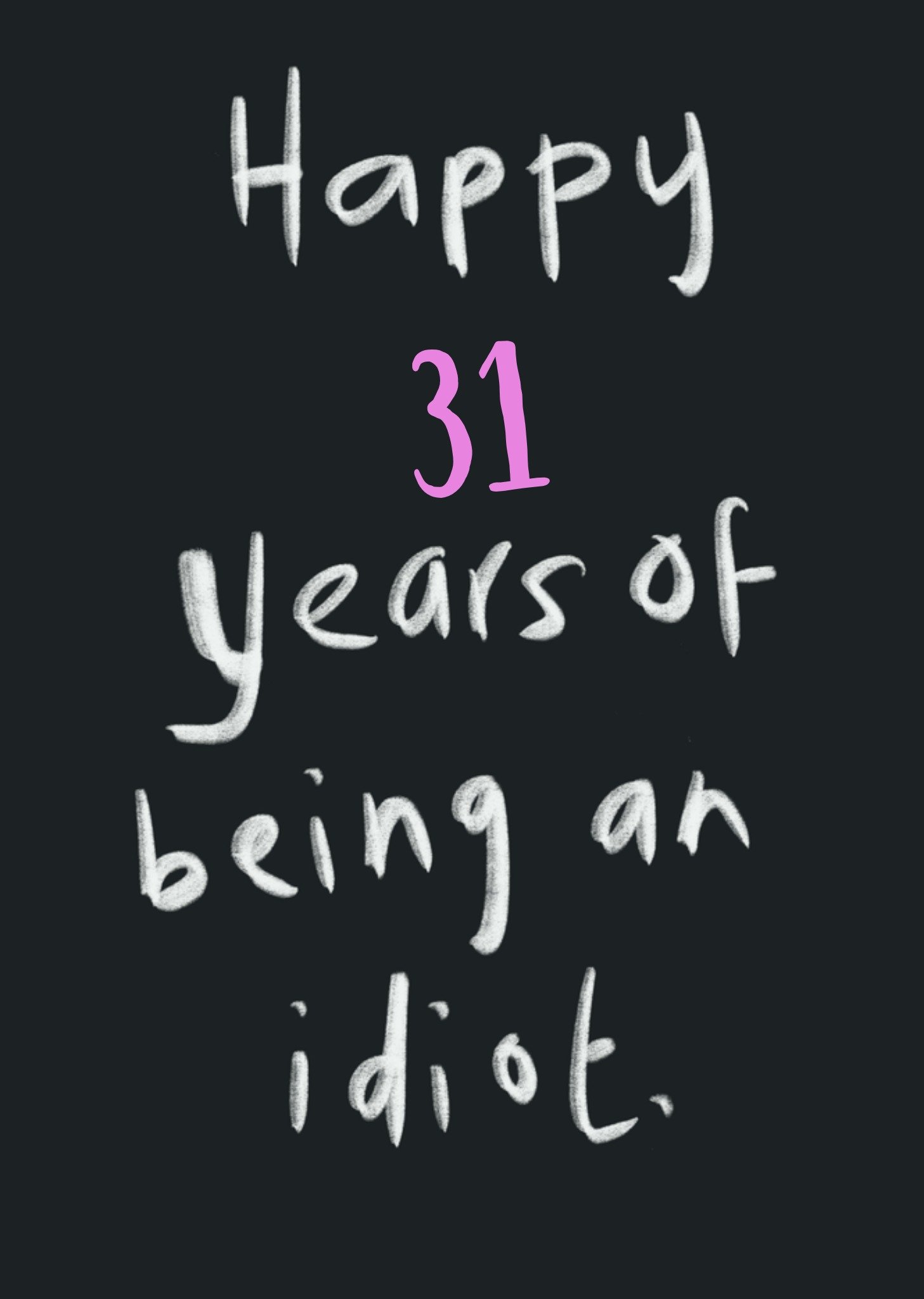 Grappige verjaardagskaart met de tekst: Happy 31 years of being an idiot. Wenskaart van Greetz ontworpen door Greetz designers, volgens de laatste trends. Voeg je eigen foto('s), tekst, & versiering toe om de kaart extra persoonlijk te maken. Je kunt de kaart toevoegen aan je favorieten of tussentijds opslaan om deze later af te maken. Toch liever een ander design? Bekijk alle verjaardagskaarten. Greetz Verjaardagskaart An idiot Postcard