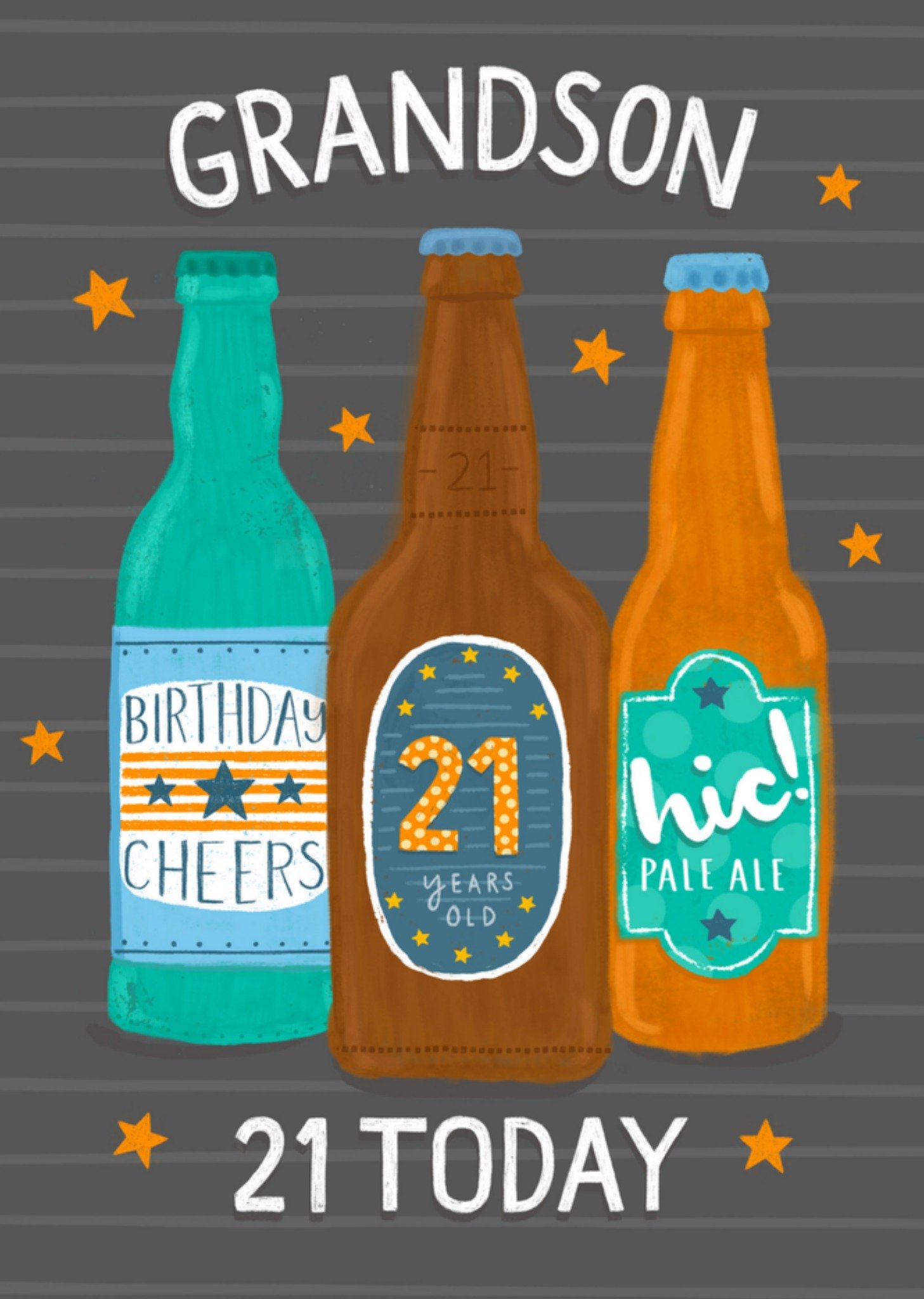 Stoere verjaardagskaart voor een jarige kleinzoon. Op de kaart staan drie bierflesjes en de teks: Grandson 21 today. Wenskaart van Greetz ontworpen door Greetz designers, volgens de laatste trends. Voeg je eigen foto('s), tekst, & versiering toe om de kaart extra persoonlijk te maken. Je kunt de kaart toevoegen aan je favorieten of tussentijds opslaan om deze later af te maken. Meer verjaardagskaarten zien? Check ze hier. Greetz Verjaardagskaart Bier met leeftijd Standard Card