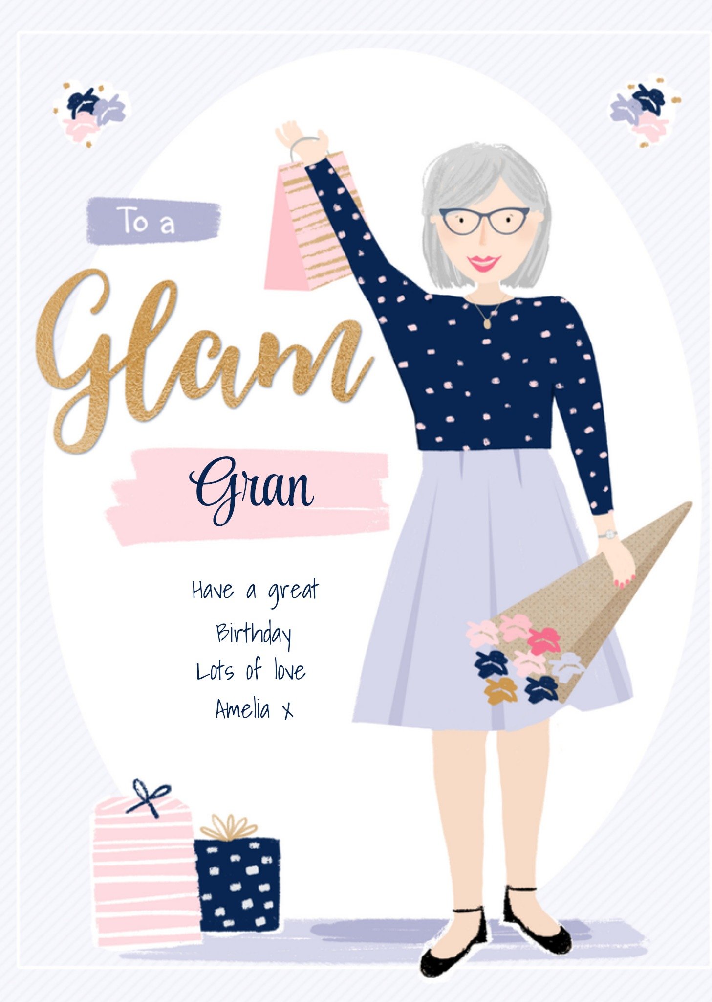 Vrolijke verjaardagskaart met daarop een oma die een bos bloemen vast heeft. Op de kaart staat: To a glam gran. Have a great birthday lots of love Amelia x. De naam op de kaart is aanpasbaar. Wenskaart van Greetz ontworpen door Greetz designers, volgens de laatste trends. Voeg je eigen foto('s), tekst, & versiering toe om de kaart extra persoonlijk te maken. Je kunt de kaart toevoegen aan je favorieten of tussentijds opslaan om deze later af te maken. Meer verjaardagskaarten zien? Check ze hier.