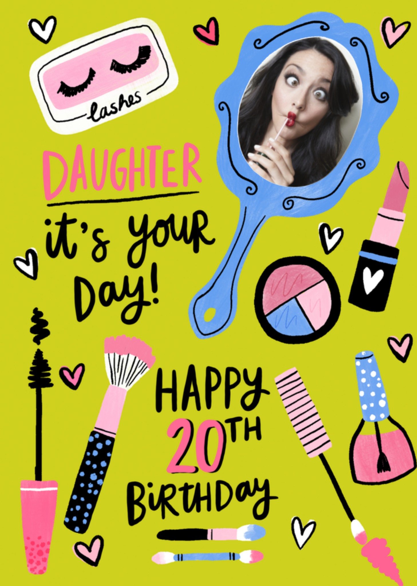 Leuke kaart met allemaal make-up en de tekst: Daughter it's your day, Happy 20th birthday. Wenskaart van Greetz ontworpen door Greetz designers, volgens de laatste trends. Voeg je eigen foto('s), tekst, & versiering toe om de kaart extra persoonlijk te maken. Je kunt de kaart toevoegen aan je favorieten of tussentijds opslaan om deze later af te maken. Meer verjaardagskaarten zien? Check ze hier. Greetz Verjaardagskaart Happy 20th birthday Postcard