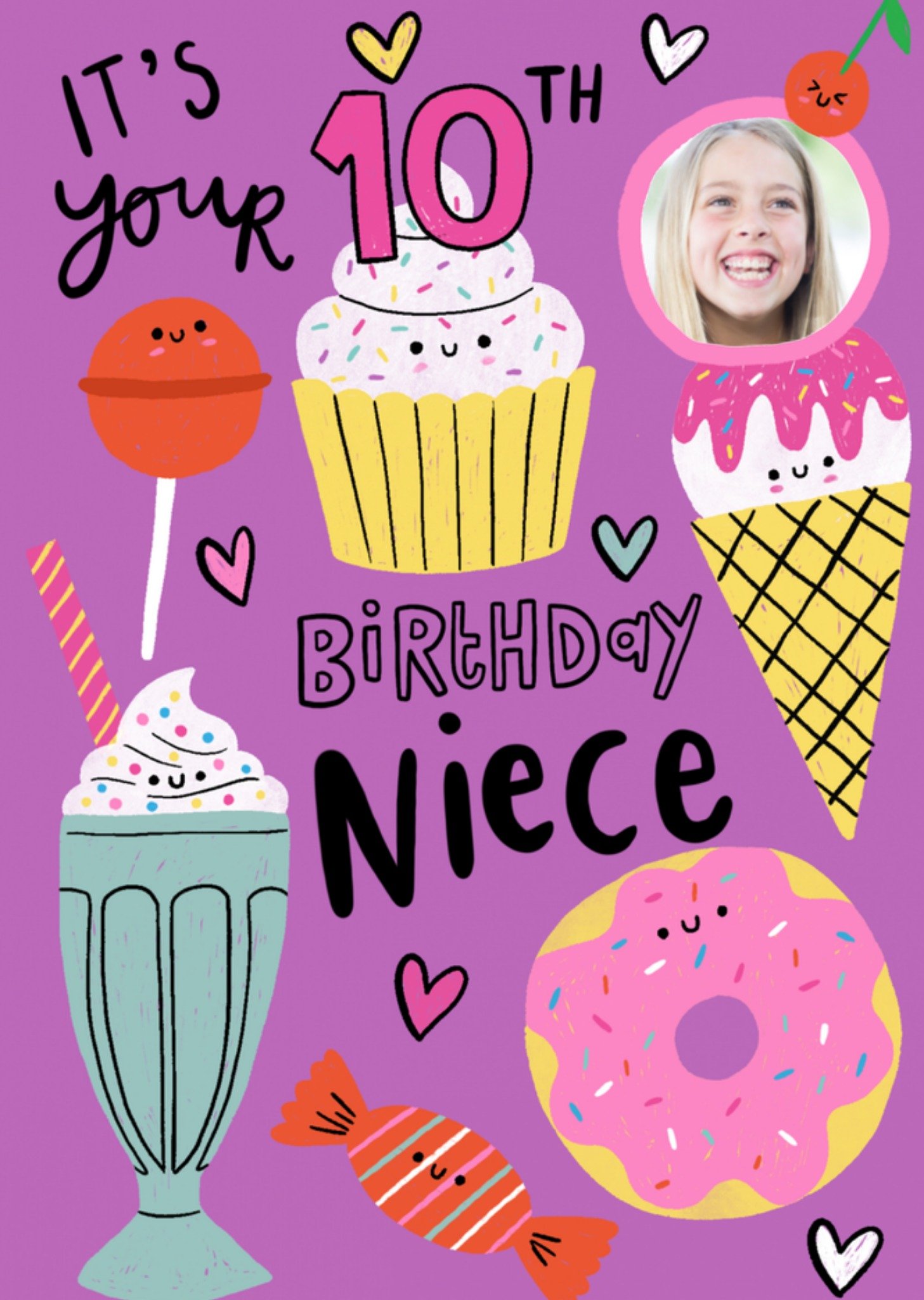 Leuke paarse kaart met geïllustreerde zoetwaren en de tekst: It's your 10th birthday niece. Wenskaart van Greetz ontworpen door Greetz designers, volgens de laatste trends. Voeg je eigen foto('s), tekst, & versiering toe om de kaart extra persoonlijk te maken. Je kunt de kaart toevoegen aan je favorieten of tussentijds opslaan om deze later af te maken. Meer verjaardagskaarten zien? Check ze hier. Greetz Verjaardagskaart It's your 10th Postcard