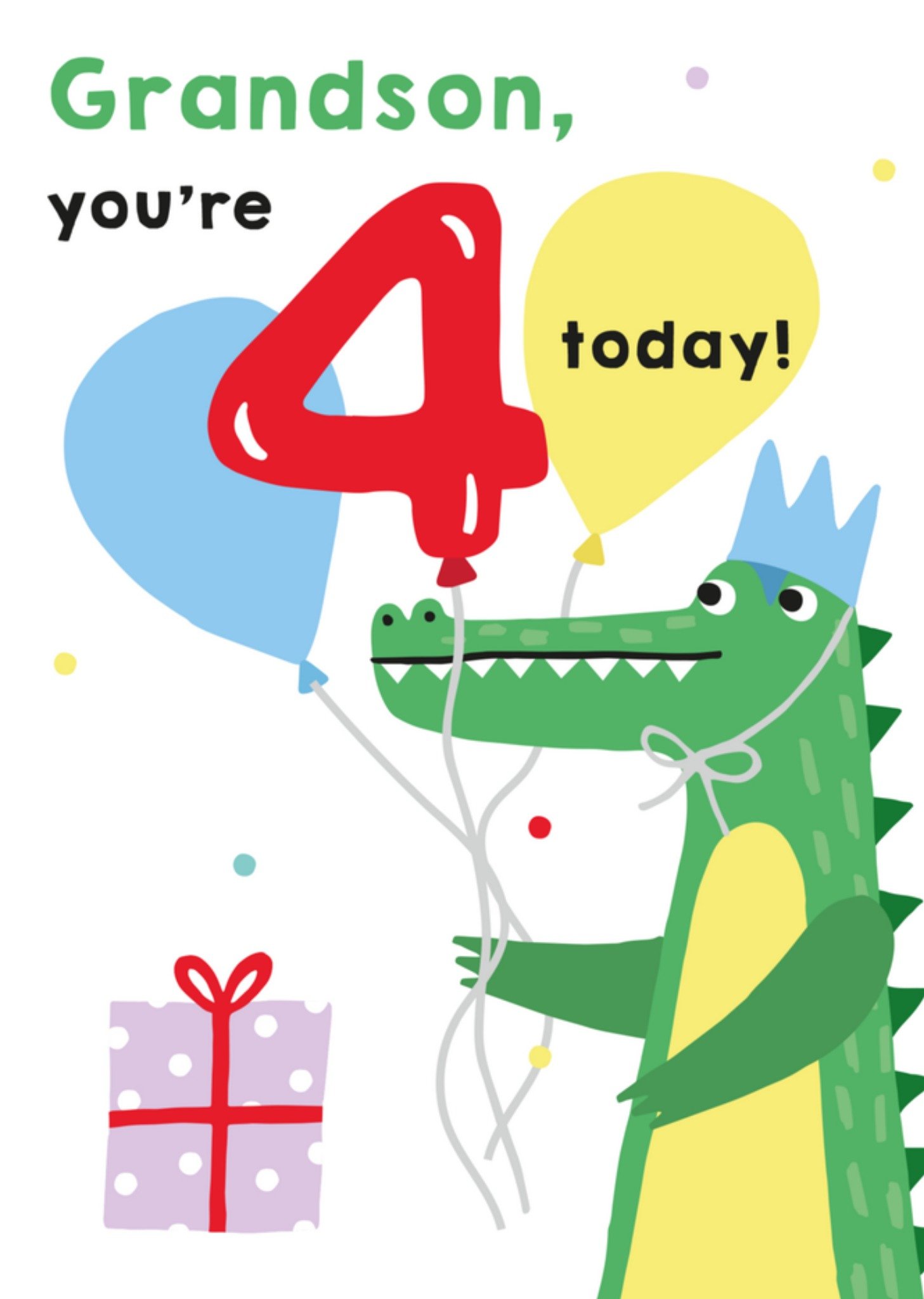 Schattige kaart met een krokodil en ballonnen. Met de tekst: Grandson, you're 4 today! Wenskaart van Greetz ontworpen door Greetz designers, volgens de laatste trends. Voeg je eigen foto('s), tekst, & versiering toe om de kaart extra persoonlijk te maken. Je kunt de kaart toevoegen aan je favorieten of tussentijds opslaan om deze later af te maken. Meer verjaardagskaarten zien? Check ze hier. Greetz Verjaardagskaart Krokodil met ballonnen Postcard