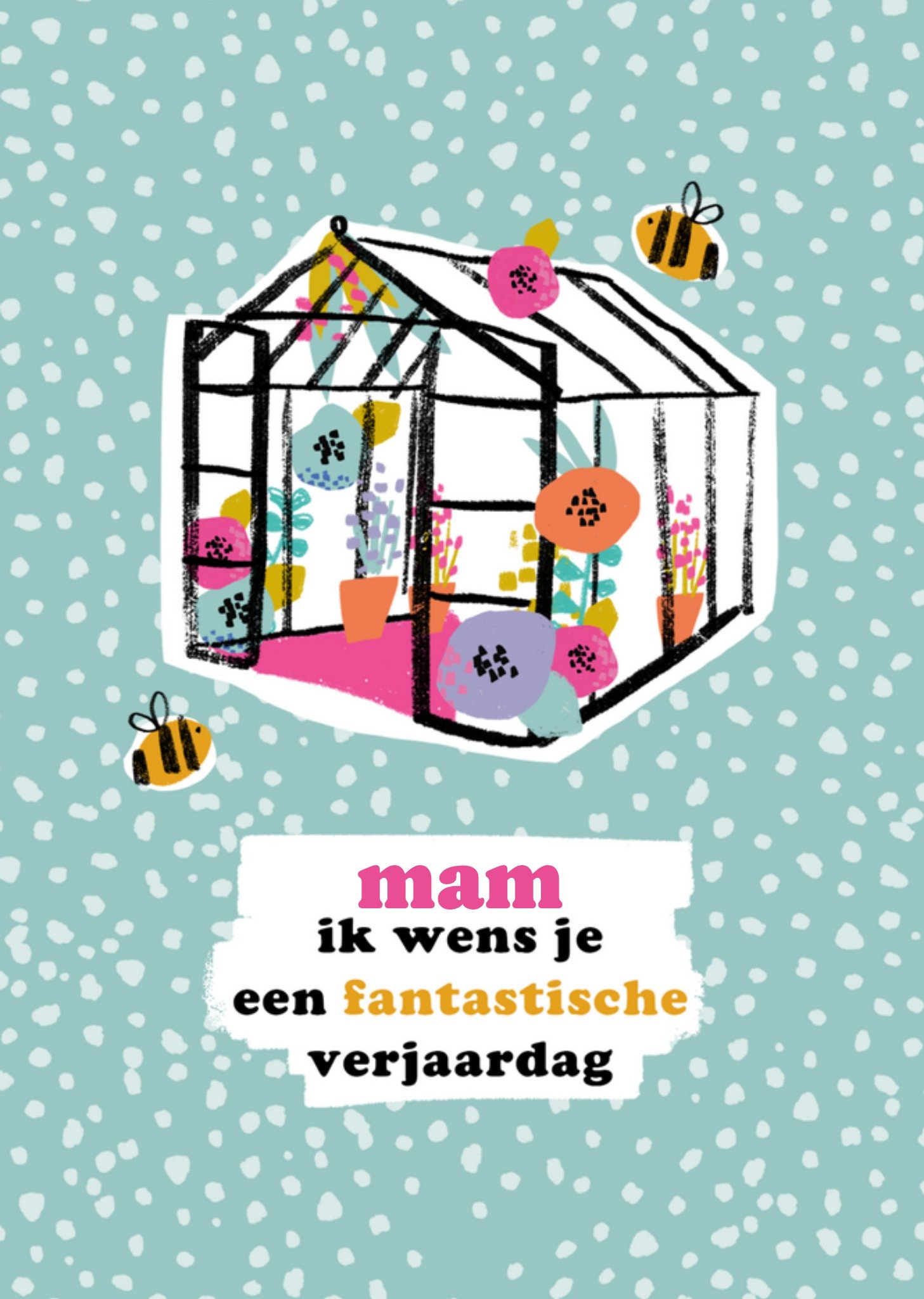 Vrolijke verjaardagskaart met een broeikas, bloemen en bijtjes. Op de kaart staat: Mam ik wens je een fantastische verjaardag. Wenskaart van Greetz ontworpen door Greetz designers, volgens de laatste trends. Voeg je eigen foto('s), tekst, & versiering toe om de kaart extra persoonlijk te maken. Je kunt de kaart toevoegen aan je favorieten of tussentijds opslaan om deze later af te maken. Meer verjaardagskaarten zien? Check ze hier. Greetz Verjaardagskaart broeikas Postcard