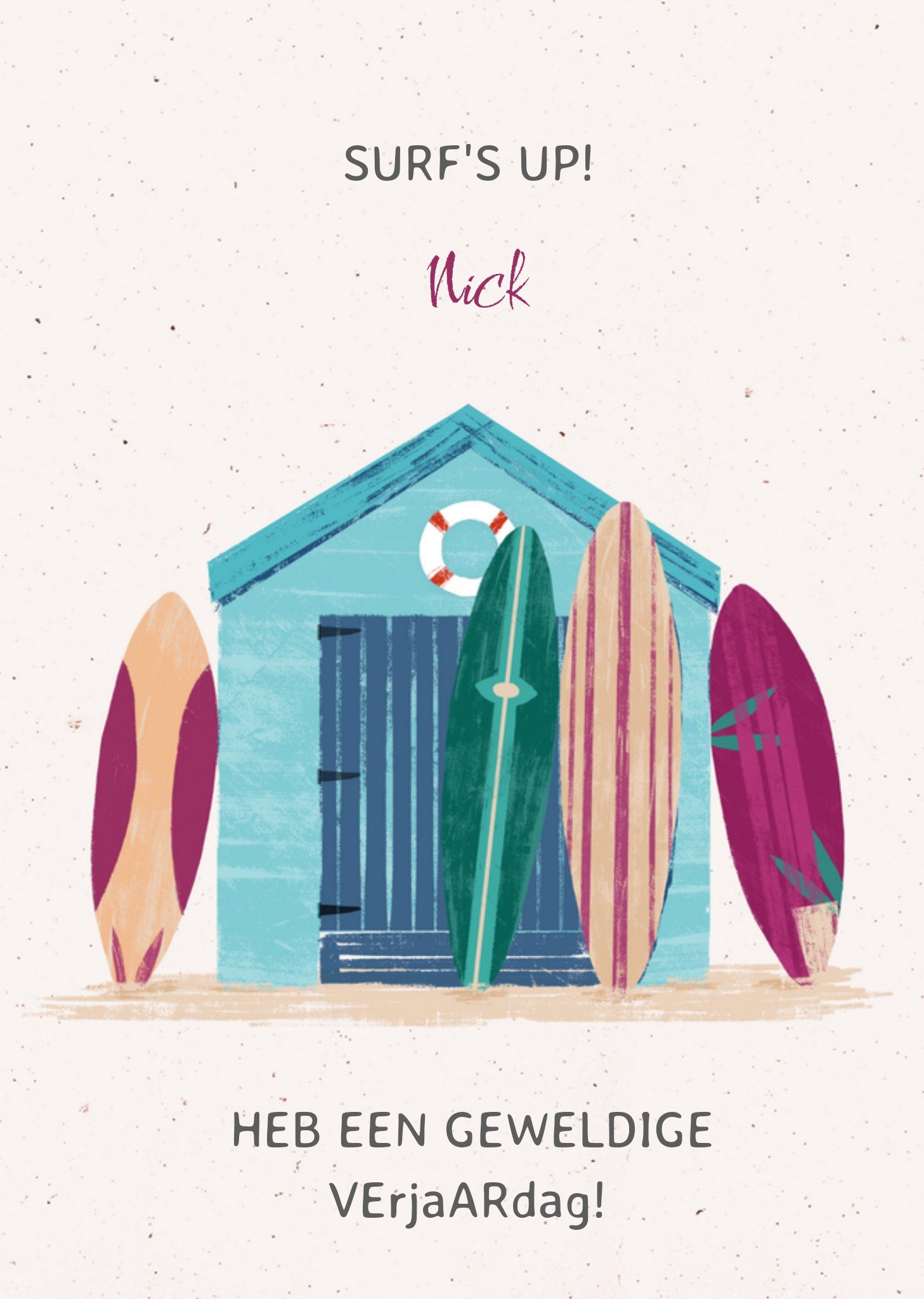 Leuke zomerse verjaardagkaart met aanpasbare naam. Wenskaart van Greetz ontworpen door Greetz designers, volgens de laatste trends. Voeg je eigen foto('s), tekst, & versiering toe om de kaart extra persoonlijk te maken. Je kunt de kaart toevoegen aan je favorieten of tussentijds opslaan om deze later af te maken. Meer verjaardagskaarten zien? Check ze hier. Greetz Verjaardagskaart surfboard Postcard