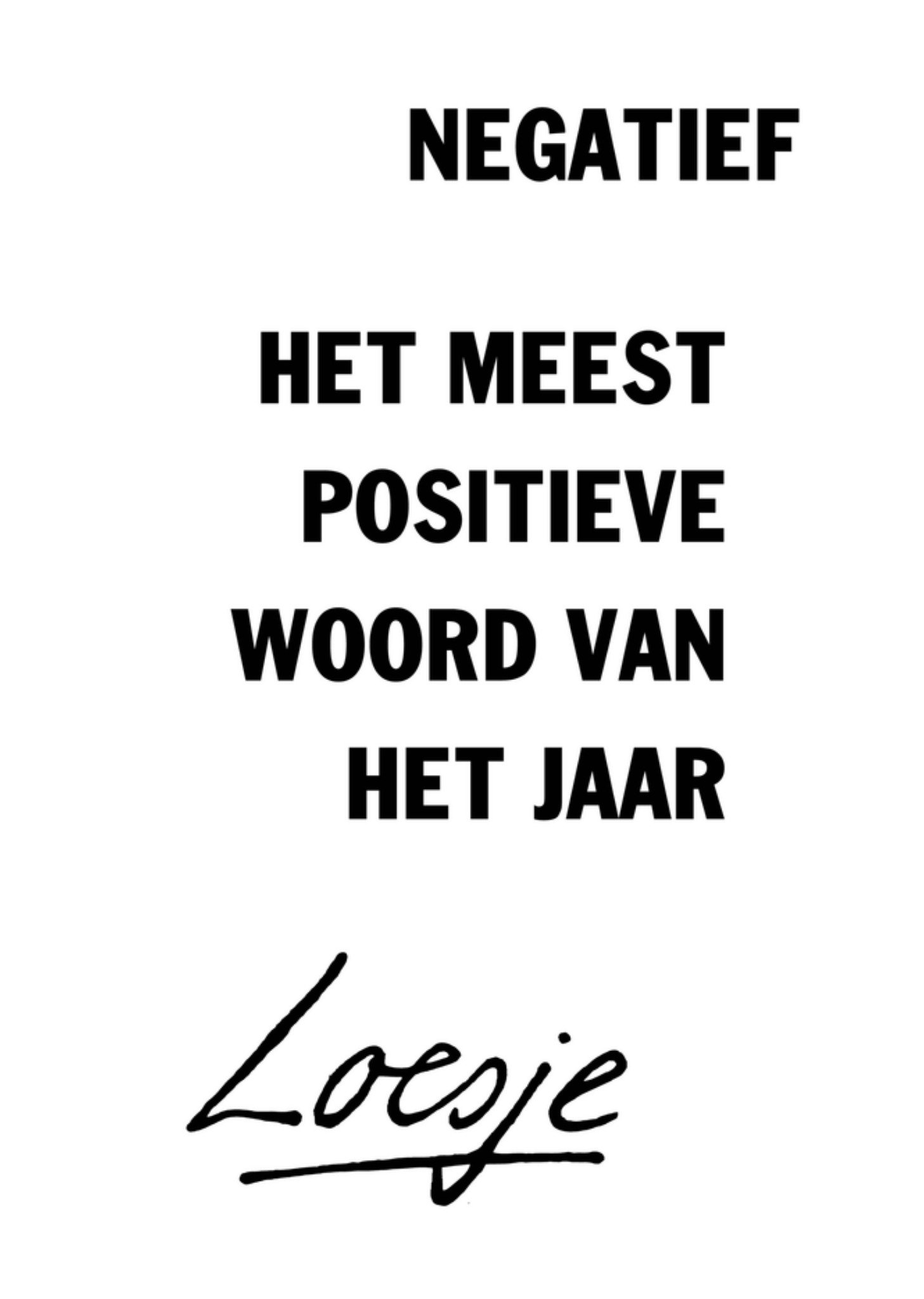 Een grappige zomaar kaart van Loesje met daarop de tekst: Negatief. Het meeste positieve woord van het jaar. Loesje ken je vast van de posters. Loesje wilt je aan het lachen krijgen, of aan het denken zetten. Ze probeert de wereld op haar kop te zetten door af en toe haar gedachten op je los te laten. Ze wil kietelen, omdraaien en huppelen tegelijk, maar het liefst van al wil ze de wereld een beetje veranderen. Met een kaartje van Loesje ben jij ook een beetje Loesje. Je helpt haar om iemand aan