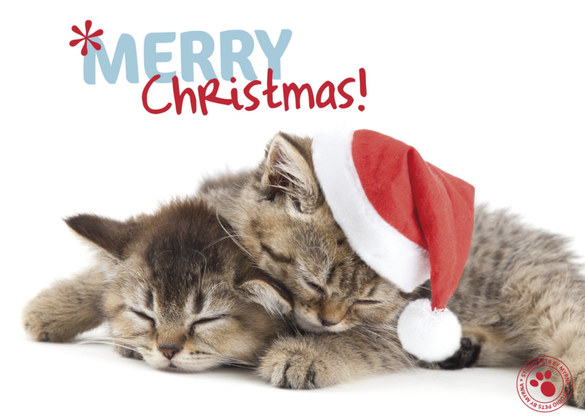 Een schattige witte kerstkaart met twee kittens om iemand een fijne kerst mee te wensen met de tekst: Merry christmas. Wenskaart van Studio Pets met lieve en grappige dieren gefotografeerd door Myrna. Voeg je eigen foto('s), tekst, & versiering toe om de kaart extra persoonlijk te maken. Je kunt de kaart toevoegen aan je favorieten of tussentijds opslaan om deze later af te maken. Studio Pets Kerstkaart katten Postcard